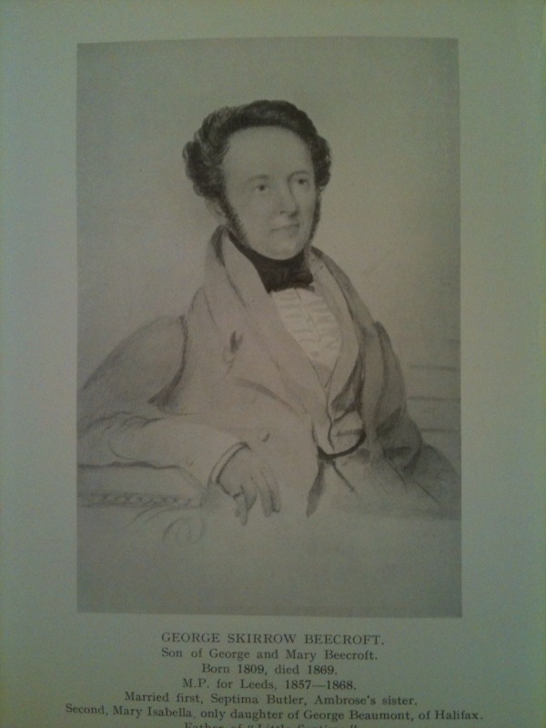 George Skirrow Beecroft was the eldest son of the late George Beecroft, of Kirkstall Forge, Leeds, by Mary, eldest daughter of the late John Audus, of Selby, co. York. He was born on the 16th November, 1809, at Outwood House, Horsforth. He married, in 1835, his first cousin, Septima Garland, daughter of the late Thomas Butler, of Kirkstall Forge. She died in 1837; had two daughters - one died in infancy, and the second, Septima, died in 1868. He married, as his second wife, in 1842, Mary Isabella, only daughter of George Beaumont, J.P., of Halifax, by whom he had issue - George Audus Beaumont, born in 1844, who died in 1873, and Mary Alice, whodied in her infancy. Mr. G. S. Beecroft was educated for a mercantile life, at Horton House, Bradford, until he was about seventeen years of age. After leaving school he was brought up to the iron trade, at Kirkstall Forge, under his father and his uncle, the late Thomas Butler, the then principal of those works. He afterwards became a partner, and, in conjunction with his relatives and partners - the present Messrs. Butler - he continued in the works until 1855, when he retired from business, and was subsequently elected M.P. for Leeds, in Jun, 1857. He always took an active part in local parochial matters, as surveyor of highways (at that time under the management of the parishioners), churchwarden, and other offices: and was a member of the Leeds Town Council from 1849 to 1856, and an active member of the Leeds Chamber of Commerce for several years, by the members of which institution a mural monument was erected to his memory in the Leeds Parish Church, the epitaph on which runs thus: - "In grateful remembrance of the services of George Skirrow Beecroft, who faithfully, ably, and zealously represented the commercial interests of his native town in three successive Parliaments. This tablet is erected by the Leeds Chamber of Commerce. Obiit March 18th, 1869." Mr. Beecroft died in London, aged 60, after a short illness, and was interred in Kensal Green Cemetery. He was a subject eminently loyal and patriotic, as well as a thorough man of business, and he also took great interest in archaeological matters. He was a J.P. and D. L. for the West Riding, and was elected M.P. for Leeds in 1857, a second time in 1859, and a third in 1864; he had the honour of seconding the Address in reply to the Royal Speech, February 34d, 1859; but declined to be re-nominated at the general election in 1869, owing to failing health, caused by unremitting and nightly attention to his Parliamentary duties. He was eminently useful to Government on all iron and steel subjects, gun trials, and manufacture. A liberal Conservative; President of the Leeds Conservative Association for several years; a supporter of the Church of England and encourager of popular education; and favourable to an extended enfranchisement.